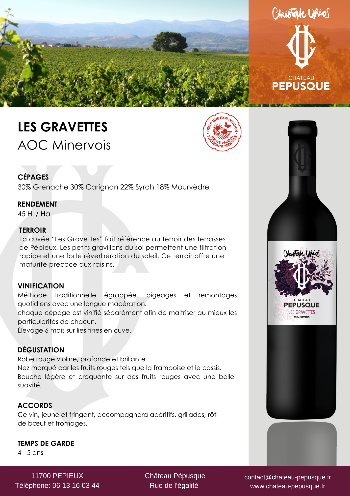 La cuvée « Les Gravettes » fait référence au terroir des terrasses de Pépieux. Les petits gravillons du sol permettent une filtration rapide et une forte réverbération du soleil. Ce terroir offre une maturité précoce aux raisins.